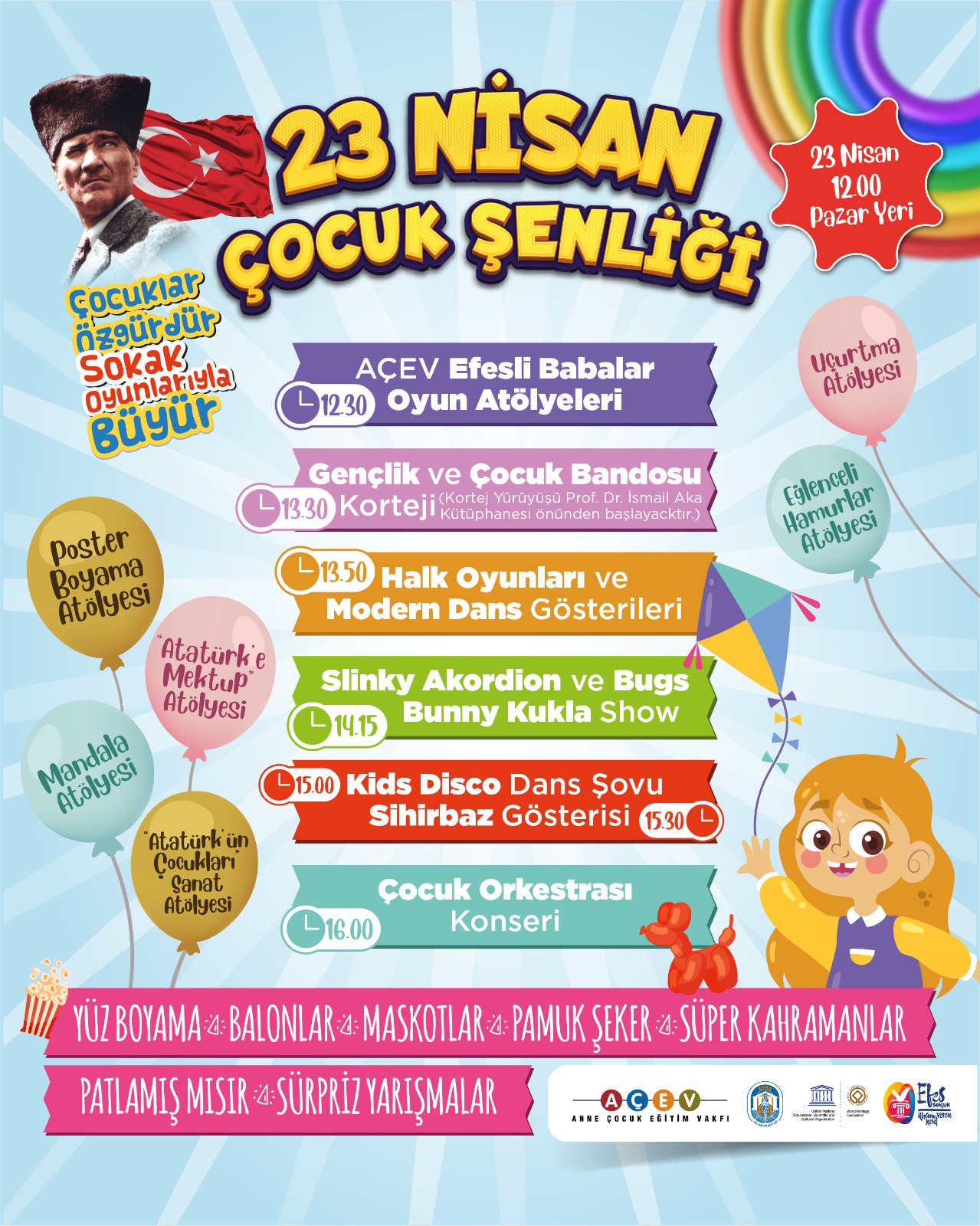23 Nisan Çarşamba günü, saat 12.00’de Pazar Yerinde başlayacak etkinliklerde, Efes Selçuklu çocuklar ve aileleri 23 Nisan Ulusal Egemenlik ve Çocuk Bayramı’nı coşkuyla kutlayacak.