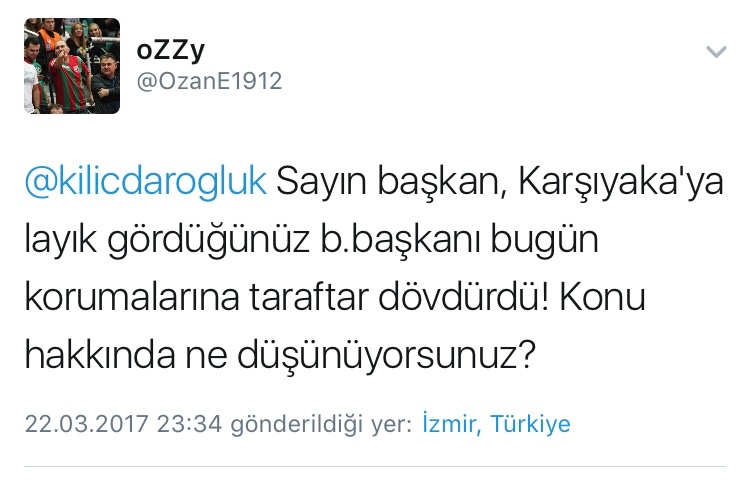 Dün Karşıyaka Basketbol takımının yine tarih yazdığı bir maç vardı. Karşıyaka belediye Başkanının verdiği destekle ikinci yarıya yenik giren takımımızın çok farklı galibiyetini izledik… Yazmayı çok isterdim. Ancak durum tam tersi oldu.. Belediye başkanı sıfatıyla türbinde yer işkal eden zat, kendini protesto eden taraftarı devre arasında korumalarına dövdürdü… Bu rezillik yetmezmiş gibi ikinci yarıda stada girip yine talimatlarıyla türbinlerde kavga çıkarttırarak çok farklı kazanabileceğimiz maçı katletti.